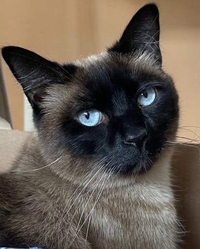 But, what about you, my precious Stewie, my beloved feline? What is your origin story? Who did you come from? How did you end up being who you are? What happened to your parents and siblings? How did you find yourself cowering behind a parking garage median, covered in fleas and grease, just fourteen little ounces? Was your mama hit by a car on California Street? Did you see it? How did a gorgeous blue-eyed Seal Point Siamese kitty end up in the Whole Foods parking lot, hiding out, alone? I’ve been thinking a lot about your beginnings today, the 7th anniversary since you so unexpectedly entered my life and blew my heart open.
